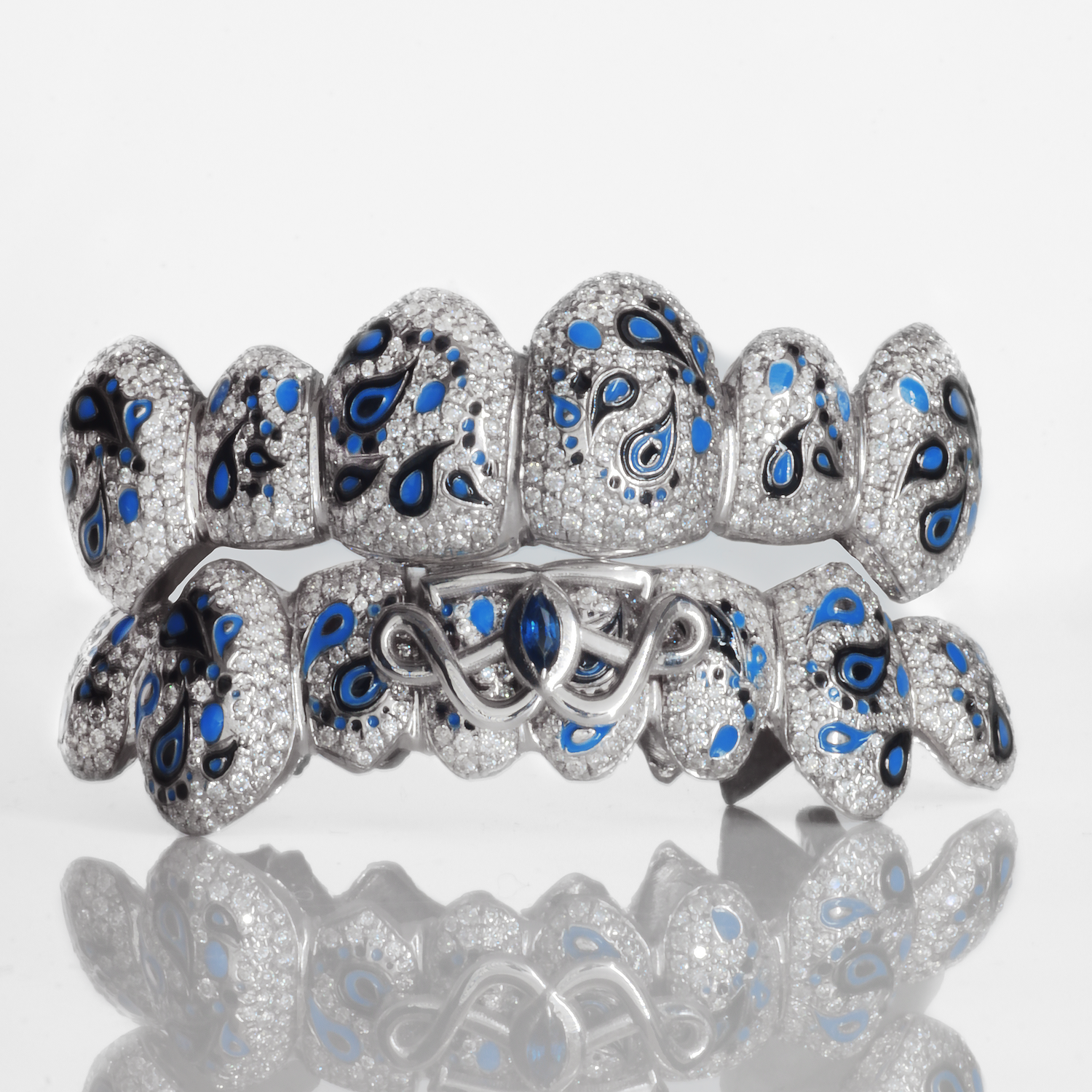 8 on 8 Solid Gold Honeycomb Diamond Setting with a Custom Enamel Paisley Design. These Grillz come in a set.